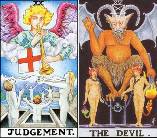 Images courtesy of the RWS Tarot. “Judgement” is astrologically correlated to Pluto, while “The Devil” is connected to the sign of Capricorn – if this doesn’t pictorially represent the necessity of heeding the call to raise our consciousness surrounding how we have become enslaved by the Capricorn structures in life (corporations and government both fall under this same umbrella, BTW), I’m not sure what does!